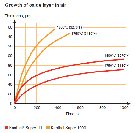 与市面上的其他加热元件相比,Kanthal Super HT 可在高达 1830°C (3330°F) 的温度下实现更快的加热和冷却过程,从而大大抑制氧化层的增长。 因此,尽可能减少了氧化层,从而减小了基体材料和周围氧化物之间的张力。 通过尽可能降低断裂或开裂的风险,提高了炉的生产效率并延长了元件的使用寿命。