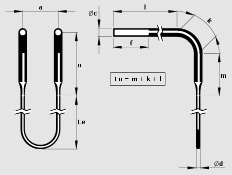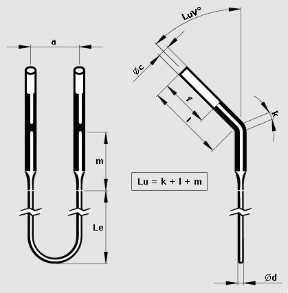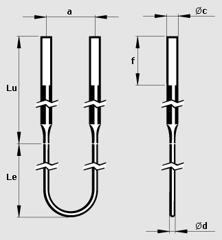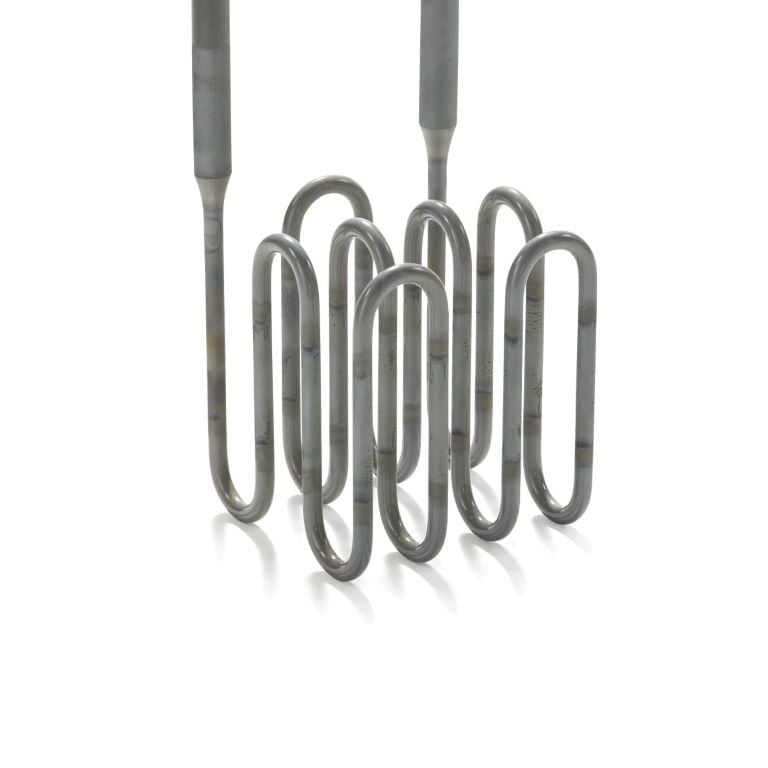 Kanthal® Super 二硅化钼加热元件有直式元件和弯式元件两种,且可提供多种尺寸和形状。 最常用的设计是双脚U型元件。 热端焊接到冷端上,冷端直径通常是热端直径的两倍。 双脚元件可以在热端或冷端弯曲45°或90°。